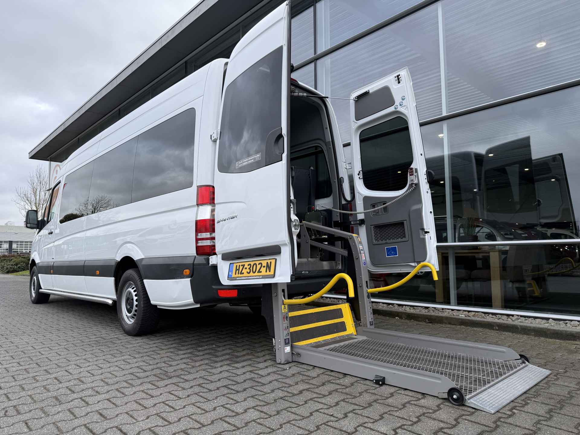Nieuw binnen: deze zeer nette Mercedes-Benz Sprinter L3H2 Rolstoelbus / Personenbus 313 2.2 BlueTEC 432 HD 130 PK Automaat uit 2016 met nog maar 242 dkm op de teller welke rechtstreeks afkomstig is van de 1e eigenaar en is voorzien van fijne opties zoals o.a. extra getint glas, audio-installatie, navigatie, telefoonvoorbereiding, side-bars, elektrische ramen, centrale deurvergrendeling met afstandsbediening, normale airconditioning + extra dakairconditioning, boordcomputer en nog heel veel meer... Daarnaast is deze keurige onderhouden Mercedes-Benz Sprinter uitgerust met een mooie en gebruiksvriendelijke FiT System Pro-vloer met een geïntegreerd rolstoelfixeersysteem voor maar liefst 5 rolstoelen, een 6-tal klapstoelen welke in een handomdraai kunnen worden omgezet tot volwaardige zitplaatsen, een verlaagde voorinstap en een volautomatische rolstoellift met groot platform waarmee ieder type rolstoel en scootmobiel veilig en comfortabel vervoerd kan worden. Mede door zijn flexibele indeling is deze fijne MB Sprinter Automaat voor vele doeleinden geschikt en prima inzetbaar is bij bijvoorbeeld uw zorginstelling of taxibedrijf. Heeft u interesse in deze of een andere rolstoelbus of rolstoelauto? Bel of app ons dan voor meer informatie op nummer 06-27392718 en maak een afspraak!